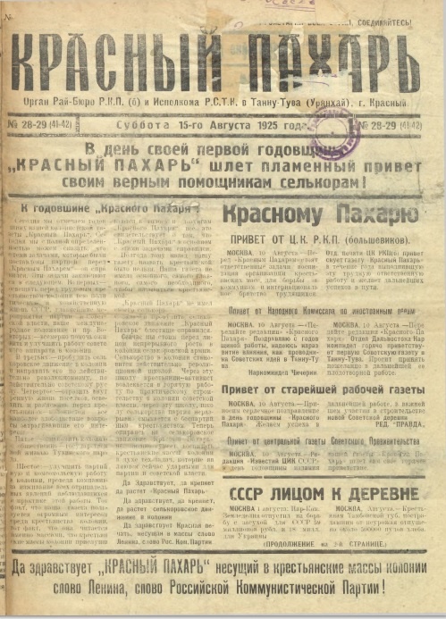 24 июля в 1924 года вышел первый номер газеты «Красный пахарь» как орган райбюро РКП (б) и Русской самоуправляющейся трудовой колонии (РСТК) в Туве. РСТК просуществовала десять лет, объединяя трудовое крестьянство и приглашенных правительством Тувы советских специалистов, советников и технических экспертов. Газета вышла на четырех полосах (страницах) форматом А 4. Редактор газеты: Л. Берлин. В № 28-29 от 15 августа 1925 года опубликованы статьи о годовщине газеты : «К годовщине «Красного пахаря», «История Красного пахаря», «Праздник в Красном». С полным текстом статей можете познакомиться на сайте Национальной библиотеки им. А. С. Пушкина РТ в разделе «Ресурсы» – подраздел Коллекция «Открывая прошлое» (Периодика Тувы).