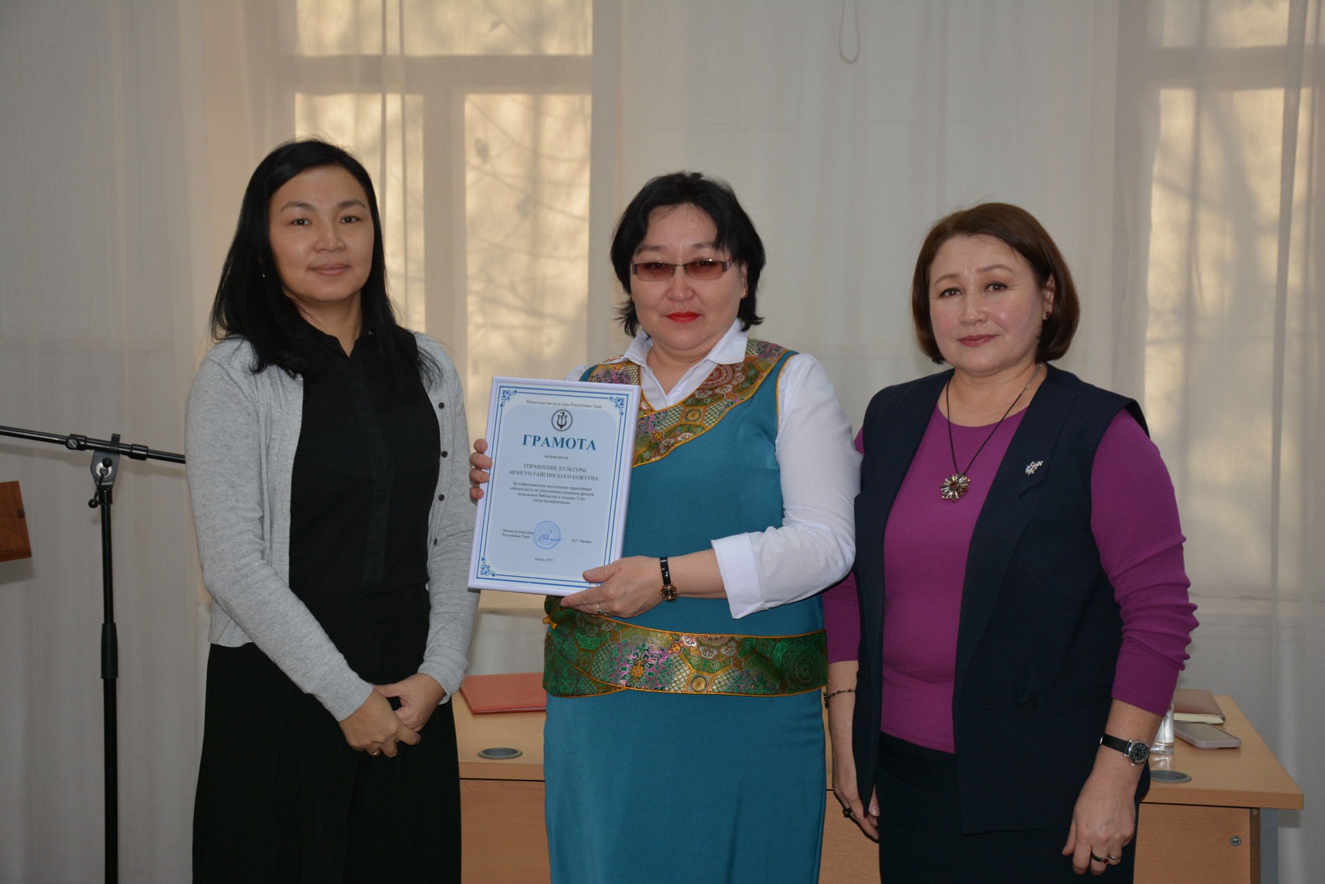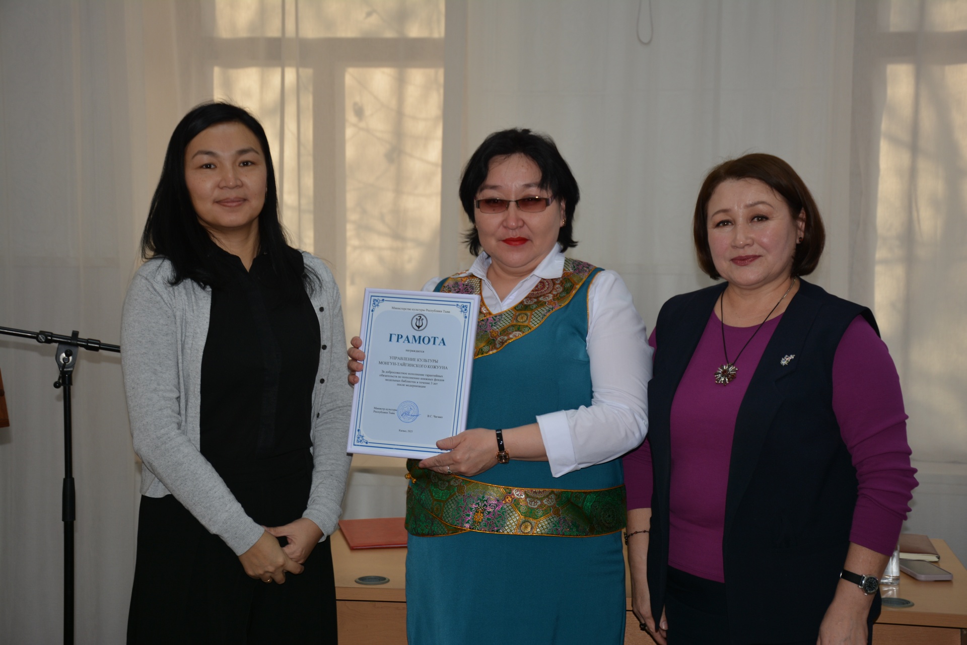 За добросовестное исполнение гарантийных обязательств по пополнению книжных фондов модельных библиотек в течение трех лет после модернизации наградили Управления культуры Дзун-Хемчикского, Монгун-Тайгинского, Сут-Хольского, Чаа-Хольского районов, Департамент культуры, спорта и молодежной политики мэрии Кызыла.