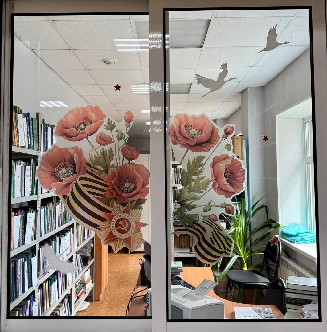 Красные гвоздики, георгиевские ленты и фотографии, отражающие подвиги солдат и трудности мирного населения, — всё это можно увидеть в нашей библиотеке.