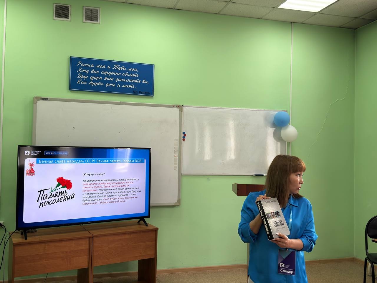 «Сегодня мы должны помнить многонациональный подвиг советского народа времен Великой Отечественной войны для сохранения мира и обеспечения дружбы народов России и стран СНГ сегодня. Только помня и передавая нашу славную боевую историю молодому поколению, мы будем жить светлым будущим», — завершила свое выступление лектор РО «Знание».Лекция завершилась обзором книги «Забытые союзники во Второй мировой войне» Сергея Брилева из фонда Национальной библиотеки и раздачей рекомендательного списка литературы «В сердцах и книгах память о войне», буклета «Война! Победа! Память!».