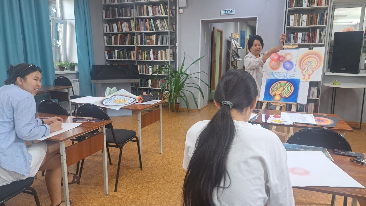 Попробовать свои силы и узнать, что такое «нейрографика», решили студентки Алдынай и Чойганмаа. Мастер-класс провела Урана Ондар. Она рассказала, что нейрографика – это метод арт-терапии, и предложила начать с рисования кругов, расширяя их на всю площадь листа А4, что будет свидетельствовать о расширении сознания.