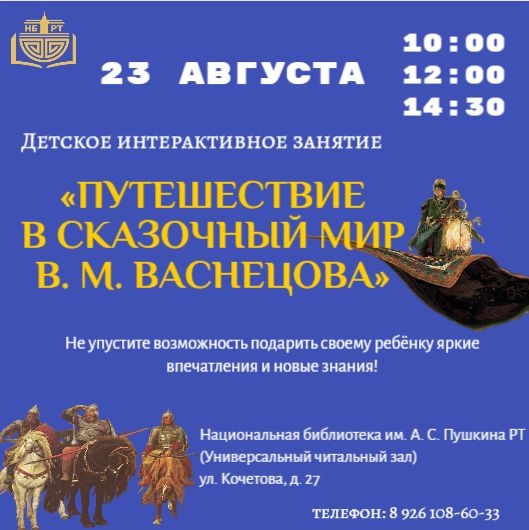 23 августа в субботу приглашаем детей школьного возраста на серию интерактивных занятий «Путешествие в сказочный мир В. М. Васнецова».