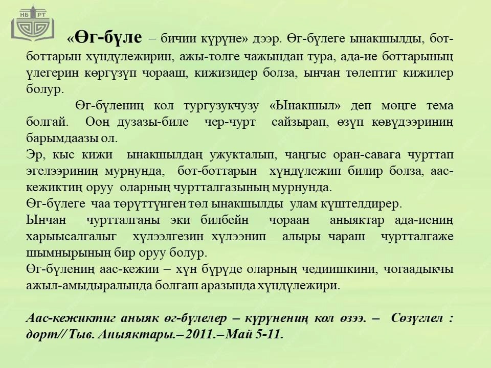 Хүндүлүг номчукчулар, чурт-шинчилел чогаалы болгаш национал библиография килдизи "Өг-бүле бичии күрүне" деп аттыг виртуалдыг делгелгеде өг-бүлениң үнелиг өнчүзүн, культуразын болгаш чаңчылдарын көргүскен.