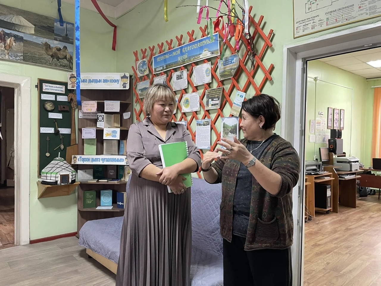 Директор Национальной библиотеки Тувы Ирина Эртине совместно с рабочей группой отправилась в село Бай-Хаак. Там она встретилась с Главой Хурала Представителей Тандинского района Уранной Нурзат, первым заместителем председателя администрации Милией Салчак, начальником управления культуры Юлией Хомушку и директором Тандинского ЦБС Юлией Иргит. Обсудили организационные вопросы, связанные с перемещением библиотечного фонда на время ремонта.