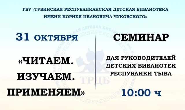 31 октября в 10:00 приглашаем руководителей детских библиотек Тувы на семинар «Читаем. Изучаем. Применяем». Встреча пройдет в Тувинской детской библиотеке им. К. И. Чуковского. Будем обсуждать важные темы работы детских библиотек.