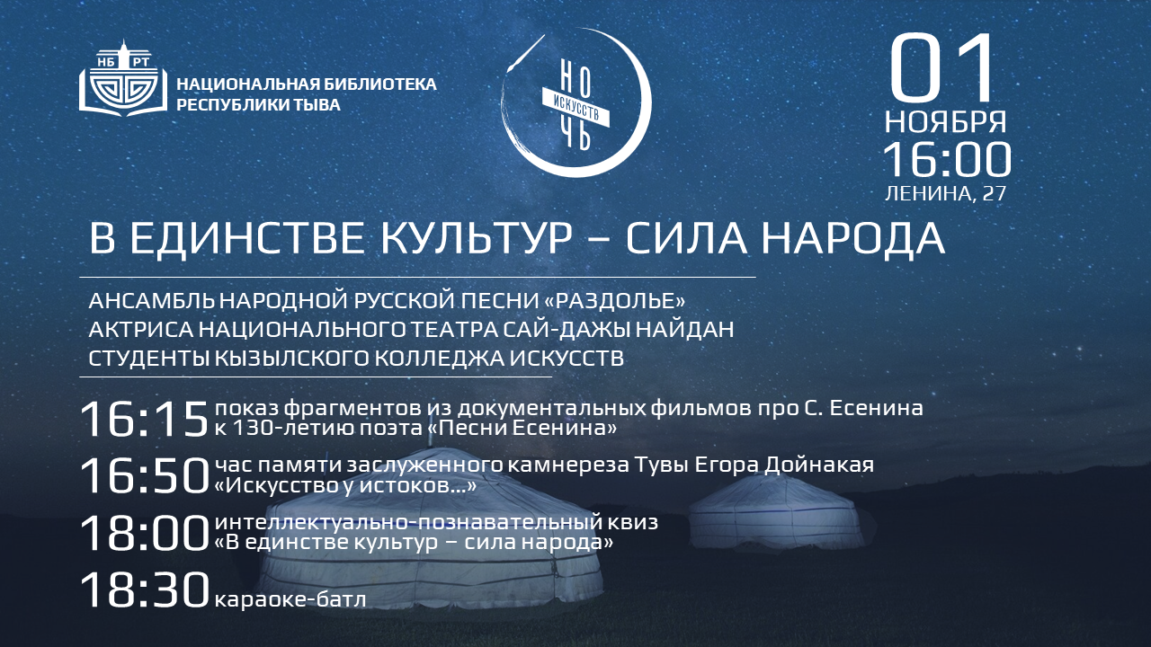 Место: ул. Ленина, д. 21 (отдел литературы по искусству и спорту Национальной библиотеки Тувы)Друзья, не пропустите грандиозное событие в мире культуры.