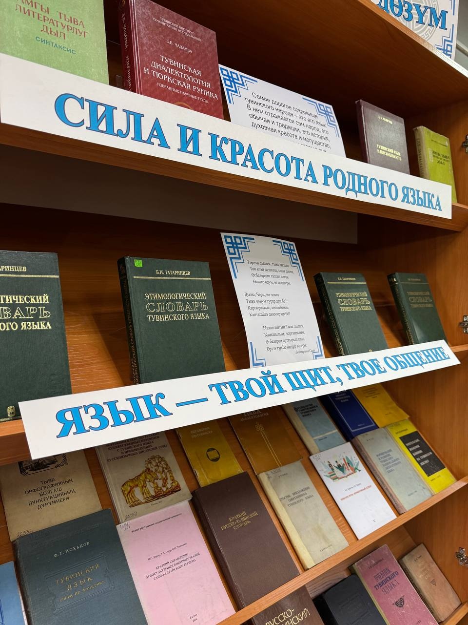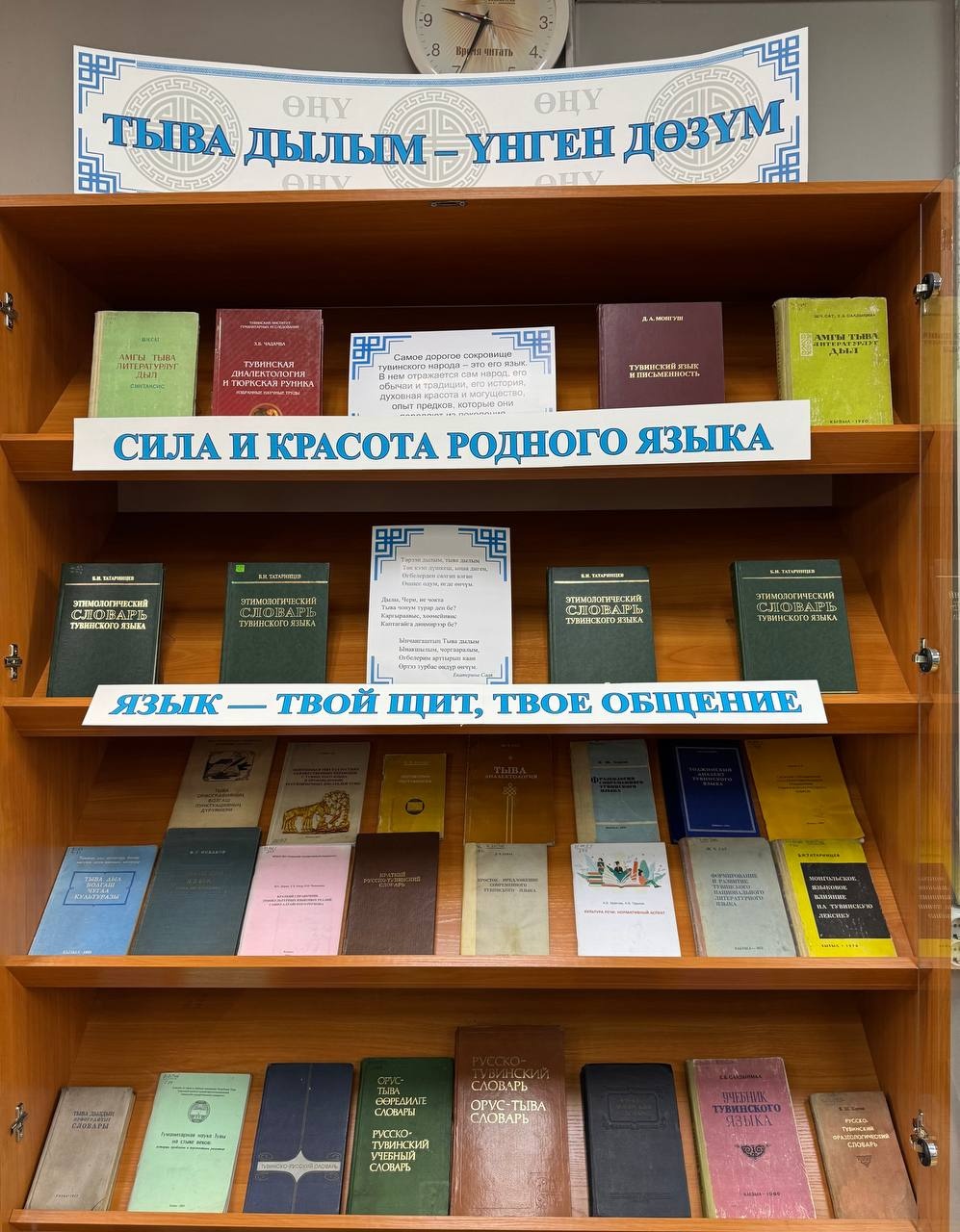 На выставке представлены издания, отражающие историю и развитие тувинского языка, его происхождение, грамматику, фразеологию, словари и разговорники.