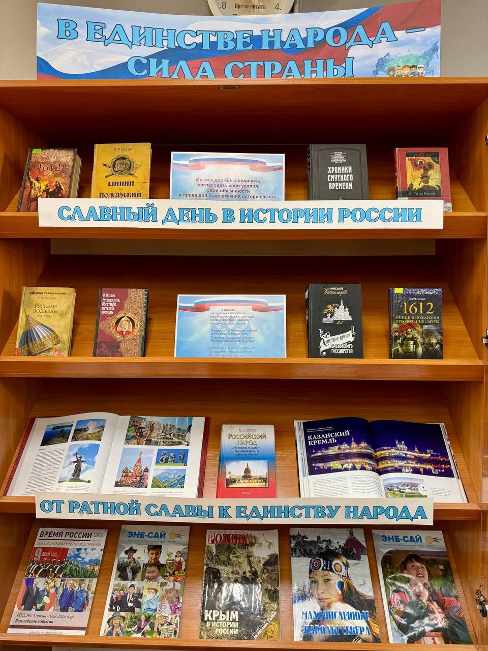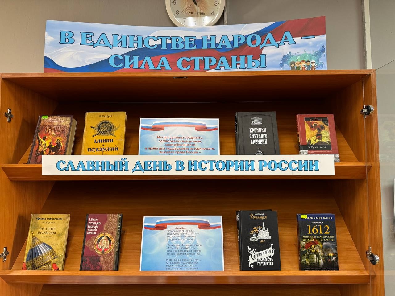 Представленные на выставке книги расскажут любознательному читателю о главных вехах в истории нашего государства, о знаменитых россиянах, прославивших свою Отчизну, а также помогут узнать о русском князе Дмитрии Пожарском и национальном герое Кузьме Минине, об освобождении Москвы от польских интервентов силами народного ополчения, руководителях народного ополчения в Смутное время. Эти книги призваны напомнить взрослым и детям, что все россияне – это единый народ с общей исторической судьбой и общим будущим.