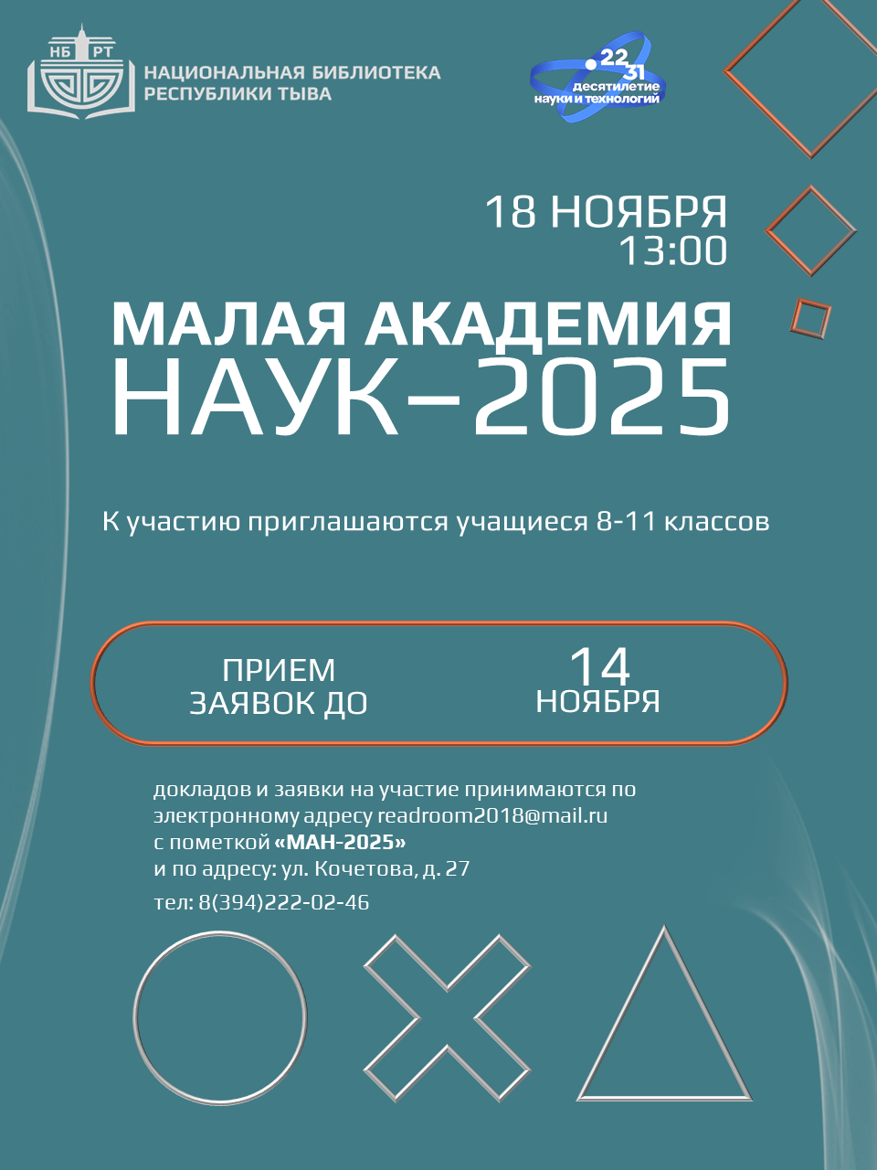 Как отправить заявку и текст доклада? Печатный вариант и электронная версия докладов и заявок принимаются до 14 ноября 2025 года на электронную почту readroom2018@mail.ru с пометкой в теме: «МАН-2025». Адрес: ул. Кочетова, д. 27, универсальный читальный зал Национальной библиотеки им. А. С. Пушкина Республики Тыва.