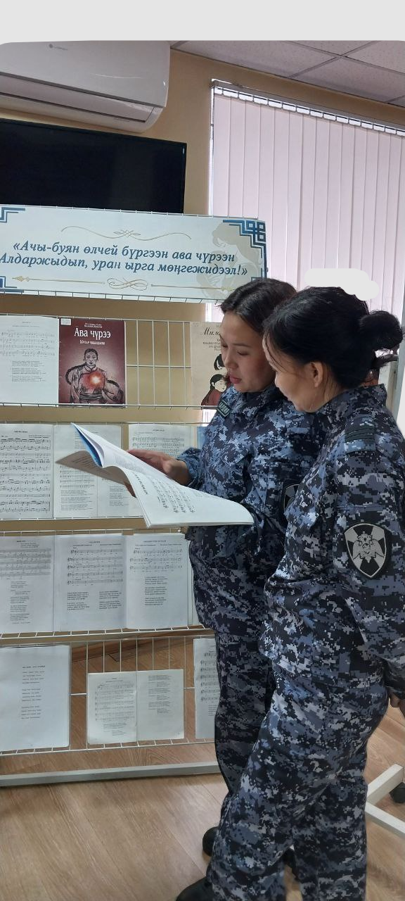 На книжной выставке представлен раздел «Ачы-буян өлчей бүргээн ава чүрээн алдаржыдып, уран ырга мөңгежидээл!», где представлены песни с нотами из разных тувинских сборников:- «Авамга», сл. А. Даржая, муз. Д. Кертик-оола,