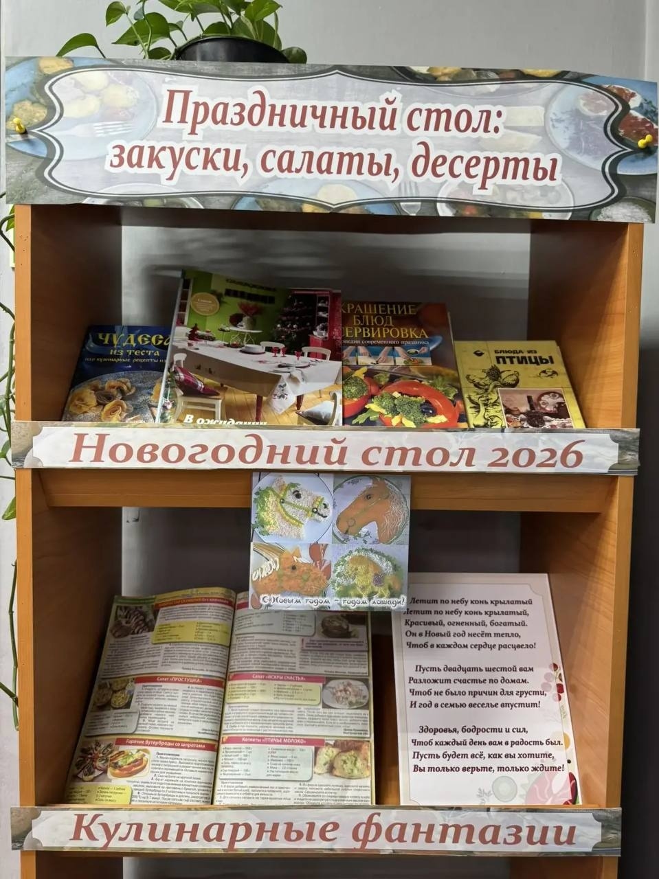 В конце декабря все «дышит» новогодним настроением. И любая хозяйка хочет накрыть потрясающий праздничный стол. Хотите, чтобы гости наперебой хвалили ваш кулинарный талант? Тогда книги и журналы нашей выставки вам в этом помогут. Здесь вы найдете самые вкусные и интересные рецепты новогоднего стола от талантливых шеф-поваров.