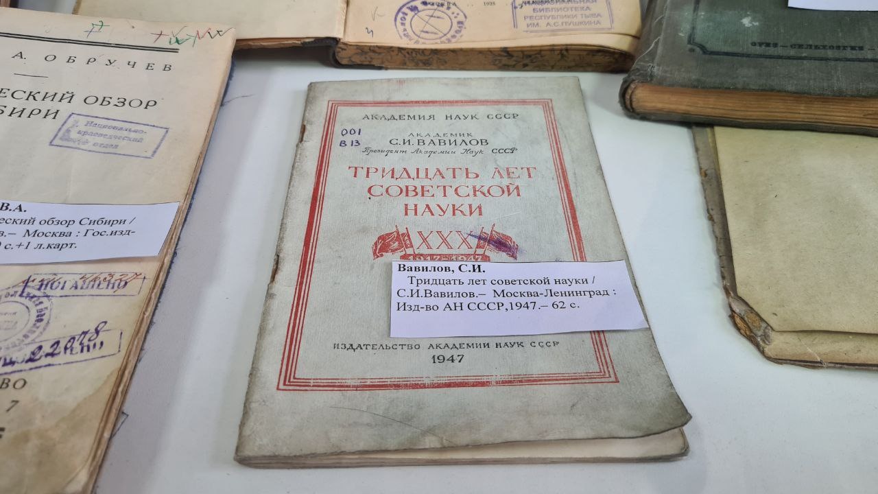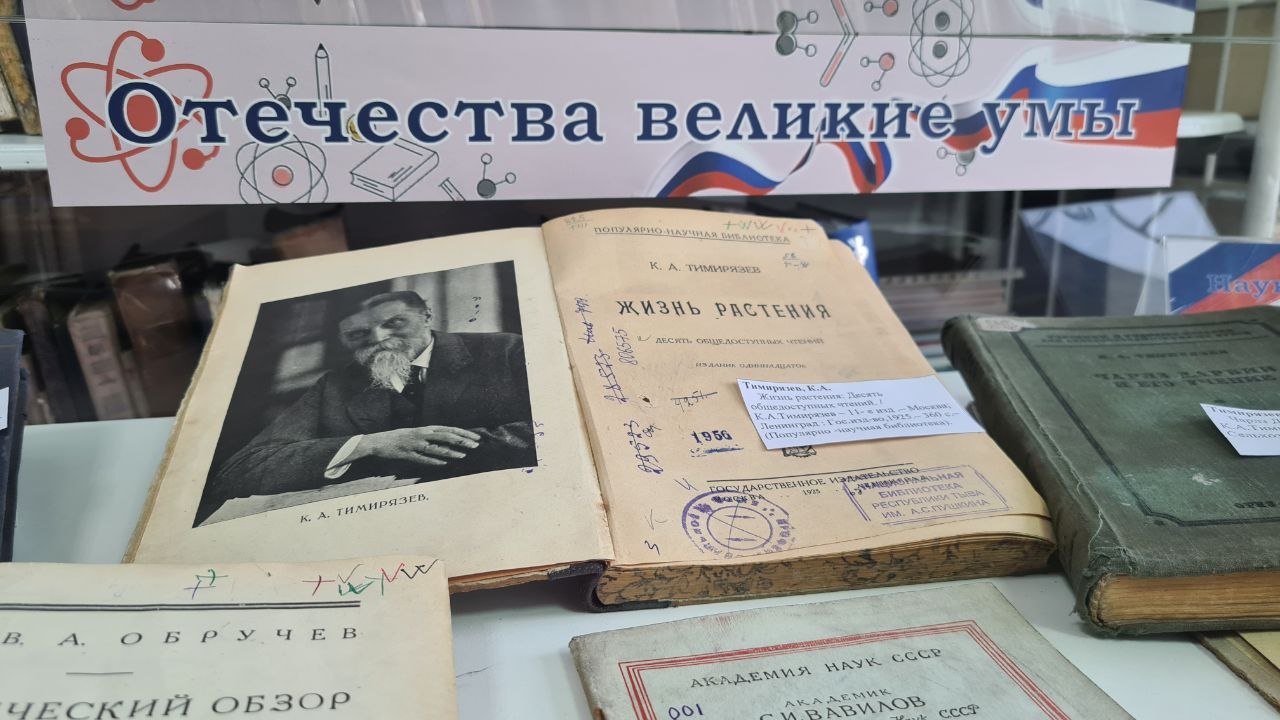 В секторе книжных памятников и редких документов оформлена книжная выставка «Отечества великие умы».Представленные книги знакомят с трудами российских ученых: Д. И. Менделеева, К. А. Тимирязева, В. А. Обручева, изданными в 1920–1940-х годах XX века. Научная деятельность Менделеева обширна и многогранна. Среди его печатных трудов – фундаментальные работы по химии, физике, метрологии. 1-й том «Сочинений» ученого, изданный в Ленинграде в 1937 году, знакомит с диссертациями «Изоморфизм в связи с другими отношениями кристаллической формы к составу», «Удельные объемы» (1856).