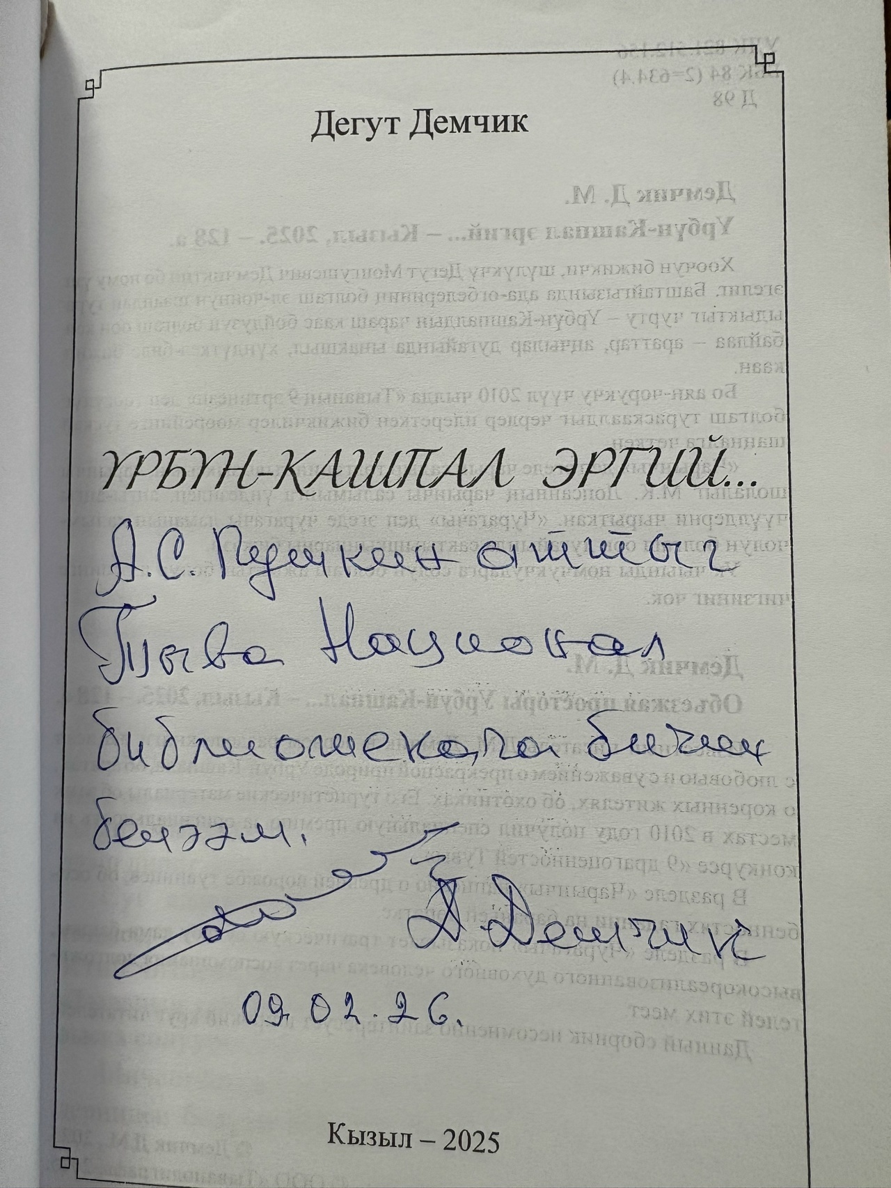 Чогаалчывыска номнарын белекке бергени дээш, улуу-биле өөрүп четтирдивис! Ам-даа демир-үжүү ылгын болуп, солун чогаалдарны бижиирин күзедивис! ТР-ниӊ А. С. Пушкин аттыг национал ном саӊыныӊ мурнундан бистиӊ ном саӊ өргээзинге аалдап келгеш белекке берген номнарыӊар дээш четтиргенивисти илередип, мөгейбишаан, ал-бодуӊарга, өг-бүлеӊерге өөрүшкүнү, каӊ дег кадыкшылды, улуг аас-кежикти, чылыгны болгаш чырыкты күзедивис, Дегут Монгушевич!