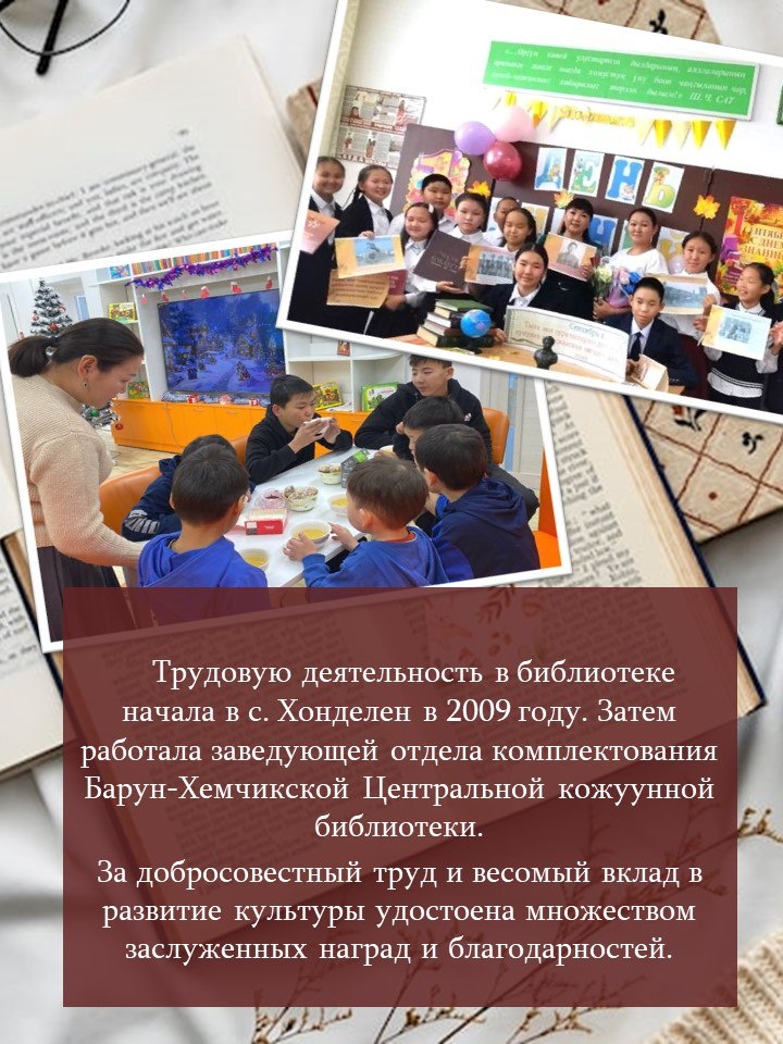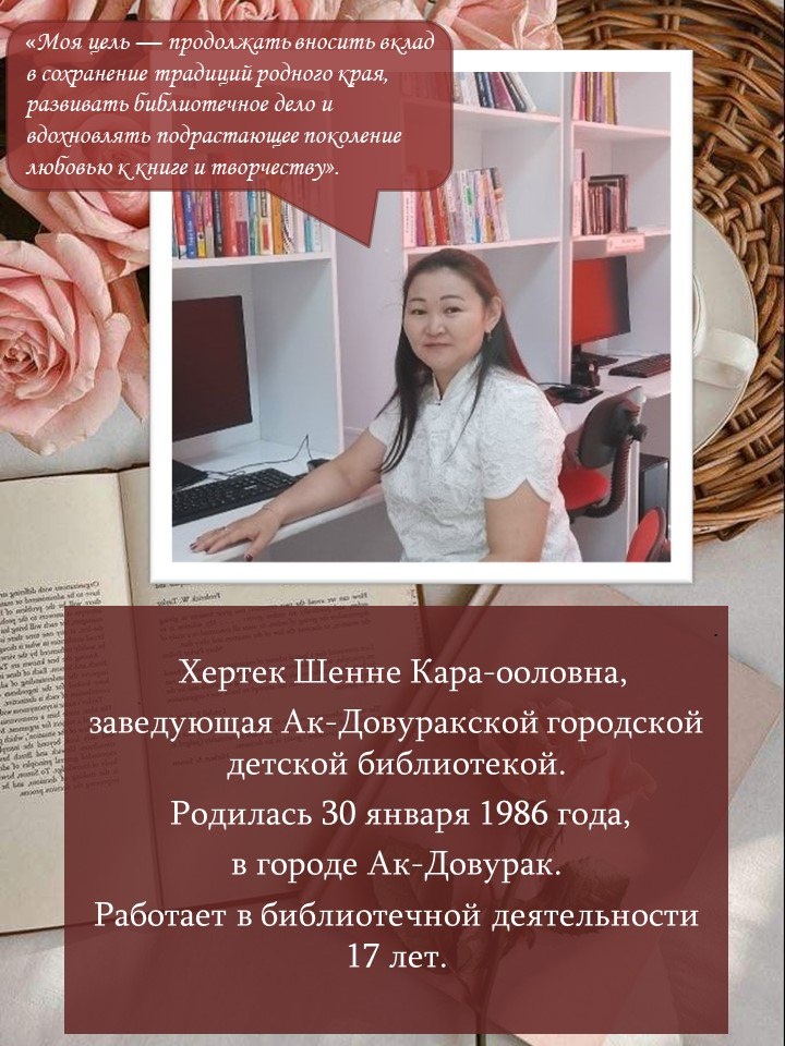 Сегодня мы хотим рассказать вам о Шенне Хертек — заведующей Ак-Довуракской городской детской библиотекой. Её жизнь и работа — настоящий пример для всех нас!В нашей рубрике мы будем раскрывать творческую, профессиональную и личную стороны людей, для которых библиотека стала не просто рабочим местом, а делом жизни.