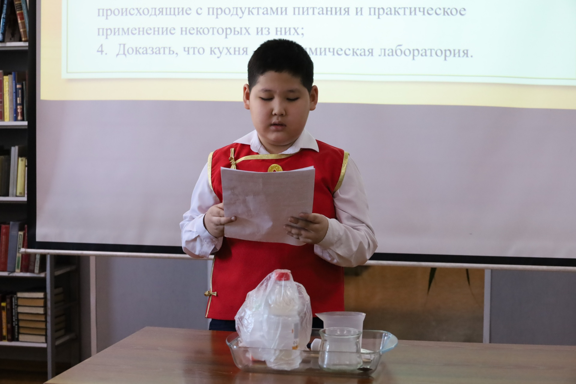 Самым маленьким участником в этом году стал Ыналай Айдар, ученик 2 «В» класса школы № 21 Кызыла. Он рассказал о занимательной химии на кухне. За основу Айдар взял реакцию обычных продуктов на кухне друг с другом. Он наглядно показал реакцию соды, уксуса и красителя. Эксперимент удался: участники наблюдали за красочным фонтаном, который получился благодаря химической реакции этих продуктов.