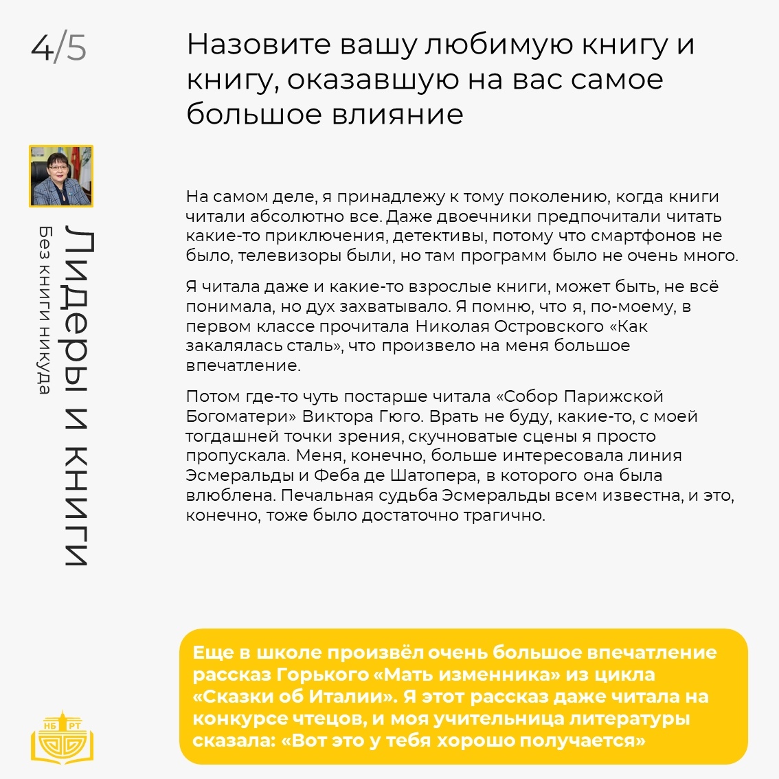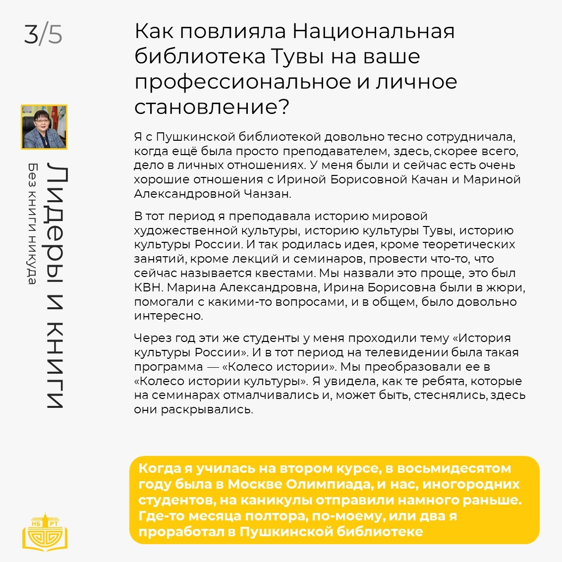 Национальная библиотека запускает новую совместную рубрику «Лидеры и книги», призванную раскрыть читательские предпочтения и библиотечный путь знаковых фигур региона, рассказать о влиянии книги и библиотеки на их профессиональное и личное становление.