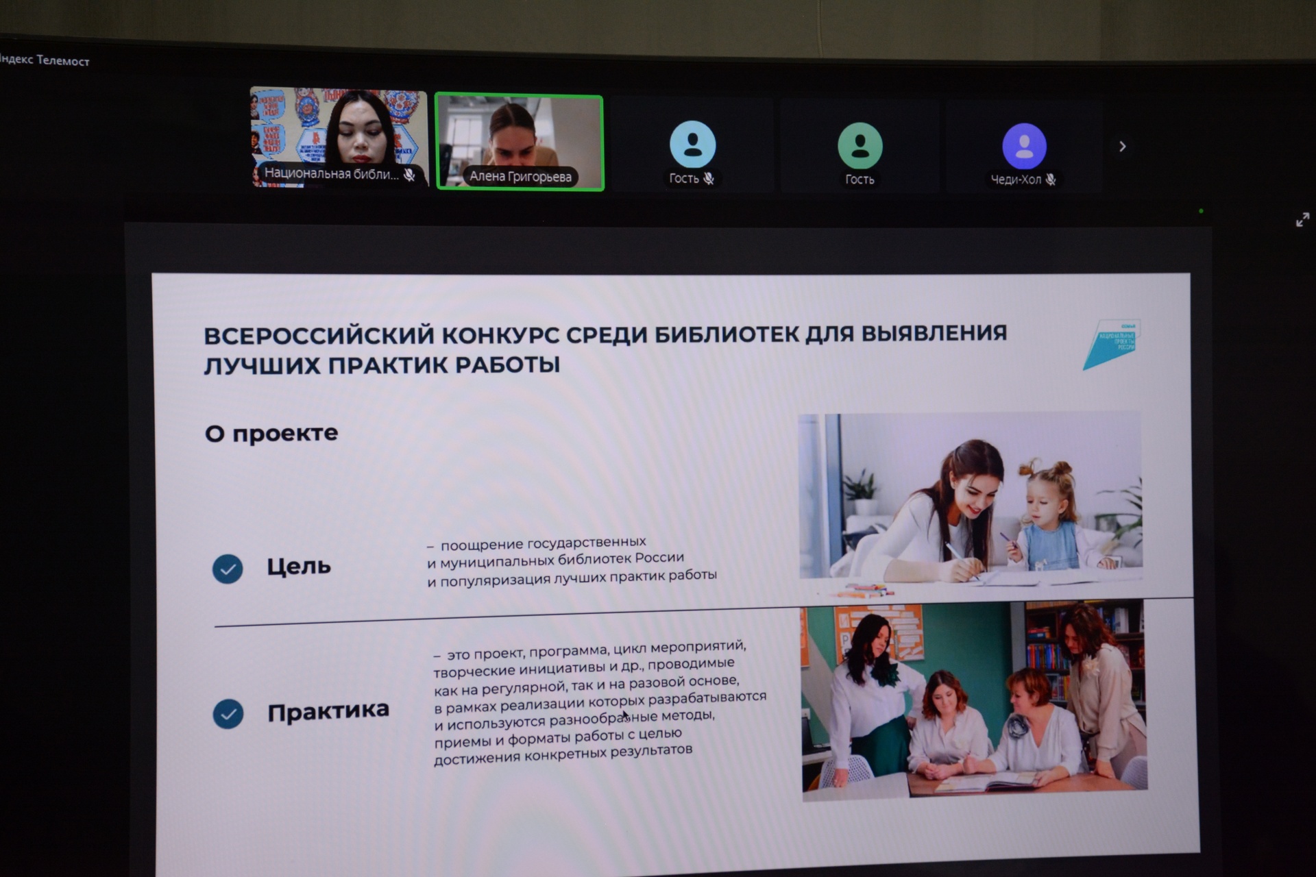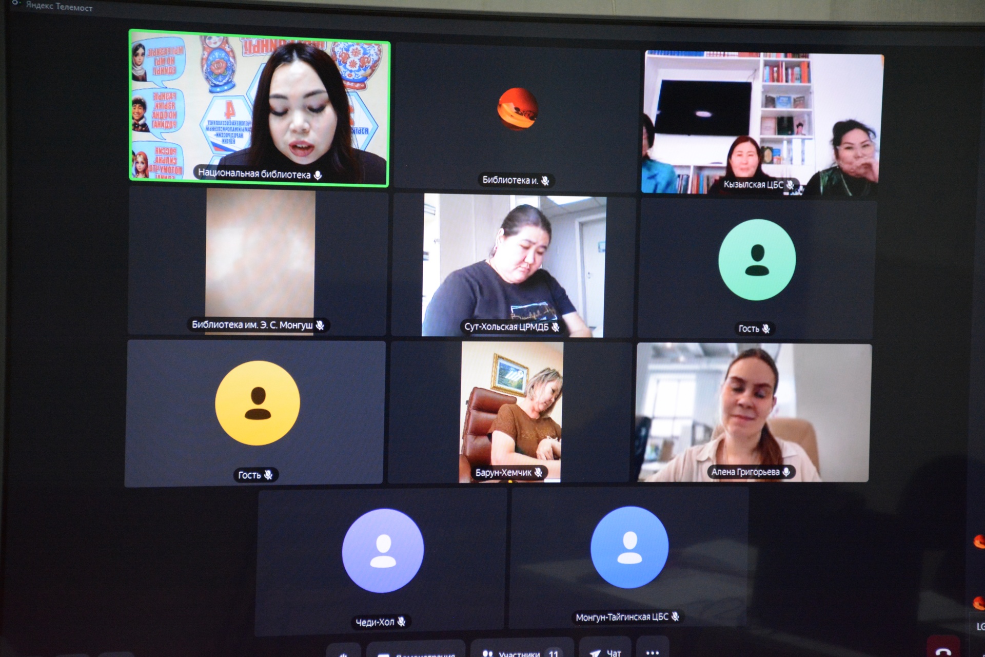 В Национальной библиотеке Тувы прошла онлайн-встреча с начальником отдела поддержки библиотечных практик Российской государственной библиотеки Еленой Григорьевой. Она помогла участникам разобраться в ошибках при подаче заявок на Всероссийский конкурс среди библиотек по выявлению лучших практик.