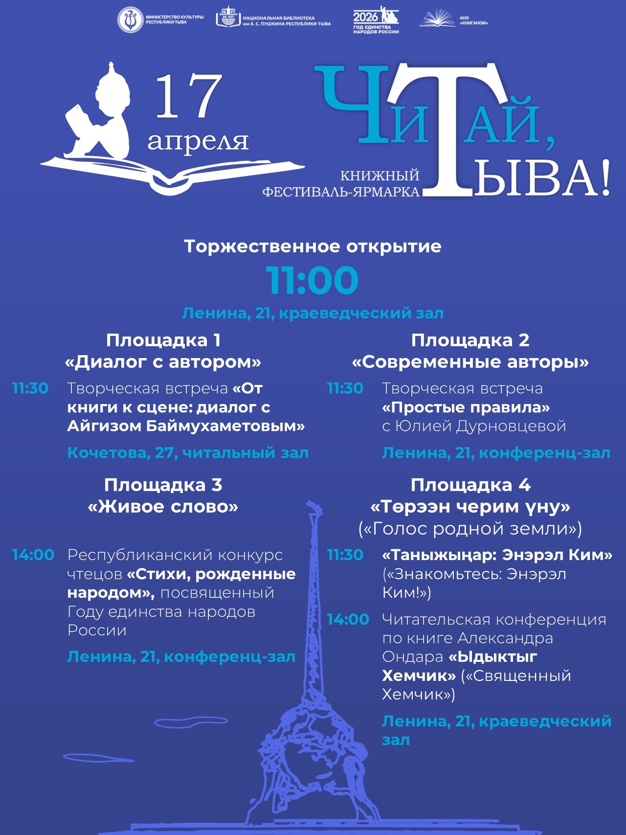 - Книжная выставка-ярмарка: новинки от ведущих издательств, включая «Эксмо», «О-Краткое» и Тувинское книжное издательство.