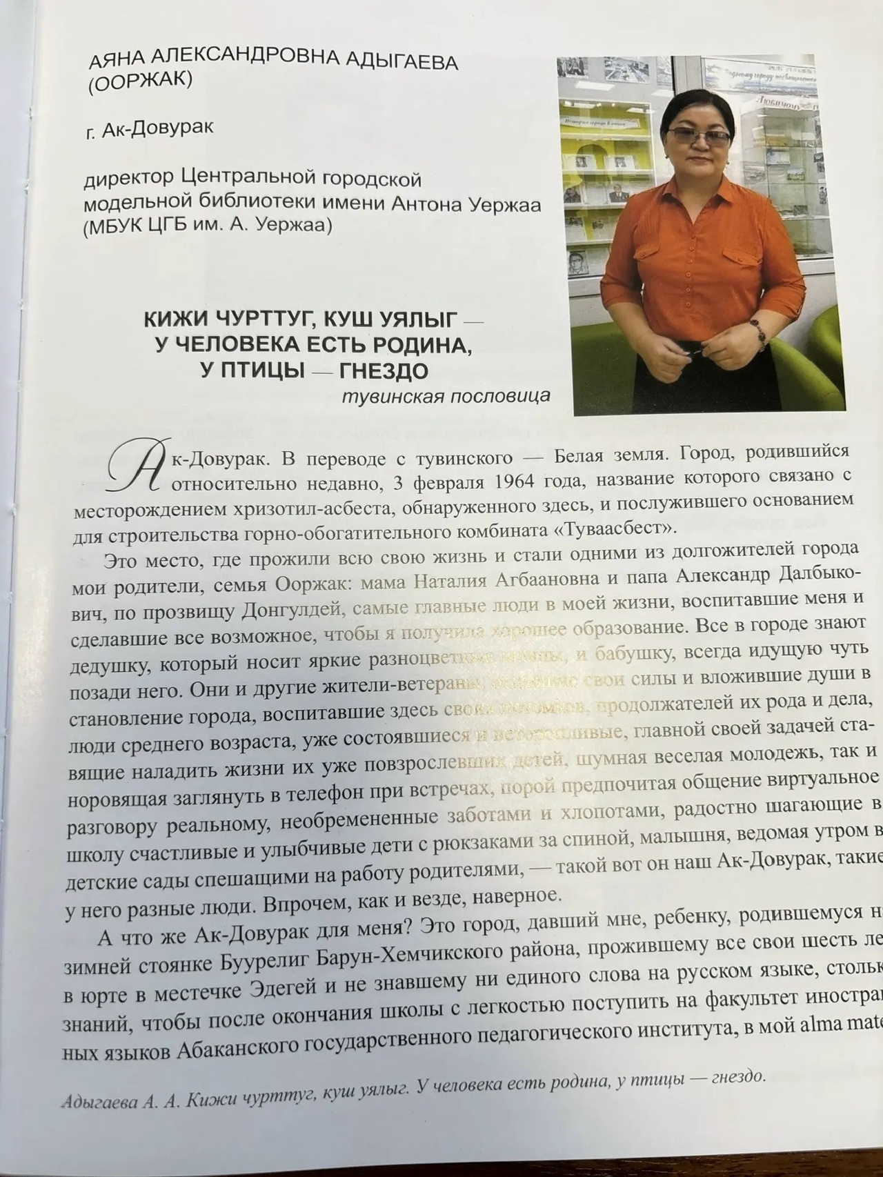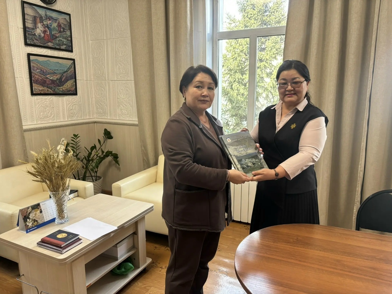 Автор Аяна Адыгаева (Ооржак) лично вручила сборник очерков «Люди Белой земли» директору Национальной библиотеки Ирине Эртине.Издание приурочено к юбилею города Ак-Довурак и объединяет живые воспоминания, истории людей, архивные материалы и уникальные свидетельства времени. В работе над книгой использованы материалы Национального архива, Национальной библиотеки, Центральной городской модельной библиотеки им. А. Уержаа Ак-Довурака, музея Ак-Довуракского горного техникума, семейных архивов героев книги.
